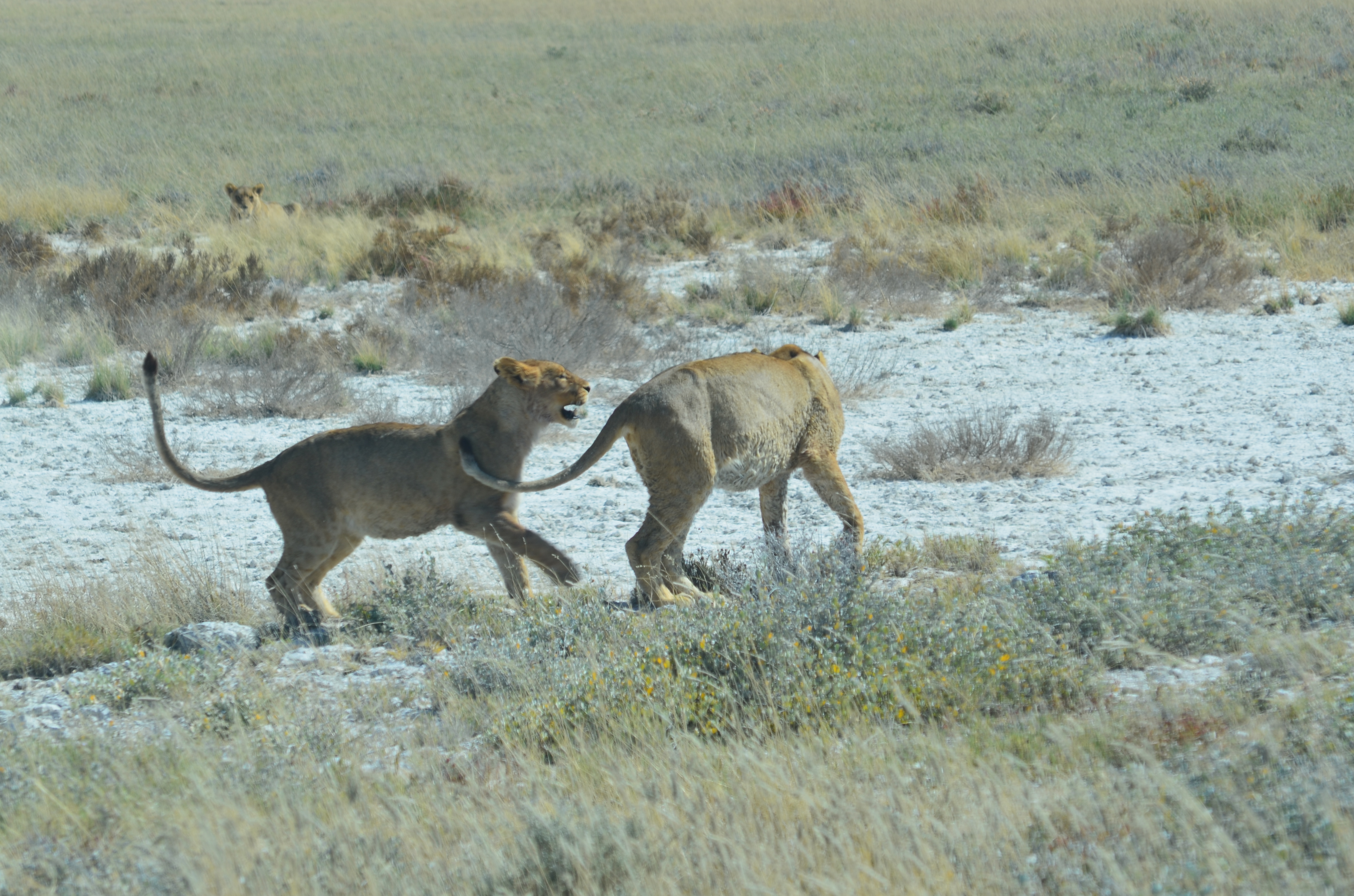Next stop was Etosha. We spent 2 nights in the Park and one night just outside the Lindequist Gate. The accommodation outside the Park (Mushara Bush Lodge) was far superioor in terms of comfort, food and facilities but nothing can beat the proximity to the animals that you get inside the Park. In the Park, we spent one night in Okuakuejo (the best waterhole in the entire West African trip) and one in Halali that is famous for the spotting of cats. We saw everything from elephants to rhinos, lions and tons of large grazers. Okuakuejo is like a theater stage, with an unbeatable wildlife show, especially at sunset. The Halali camp has a different atmosphere and a less scenic waterhole. The reason why we will always remember Halali is for its night game drives. In the park camps you can drive freely in and out during the day but the gates are closed at sunset. They do offer the possibility to see the game at night with their own experience drivers. And this is for the best as we would not have been able to see/spot anything at night. However it is at night that the ‘cats go out to play’! So we witnessed a full blown lion vs hyena fight over prey. In that moment it felt really dangerous, with only an open safari Jeep’s protection bar between us and a cornered female lion. When the driver said that she might hide under the car (she was being chased away by 3 hyenas) my hear probably skipped a beat. ‘Luckly’ she called out for reinforcement and 4 more lion friends joined the squabble. There is no way to explain the sounds that filled the air, from both lion and hyena, each trying to re-assert their superiority. Finally the hyenas were chased away and the small lion pride stated enjoying their dead springbok. A great adventure came to an end, with a few photos left to remind us witnessing the fight for survival in nature. Unfortunately, as it was the middle of the night and the animals kept jumping at each other, photos are not of the best quality.