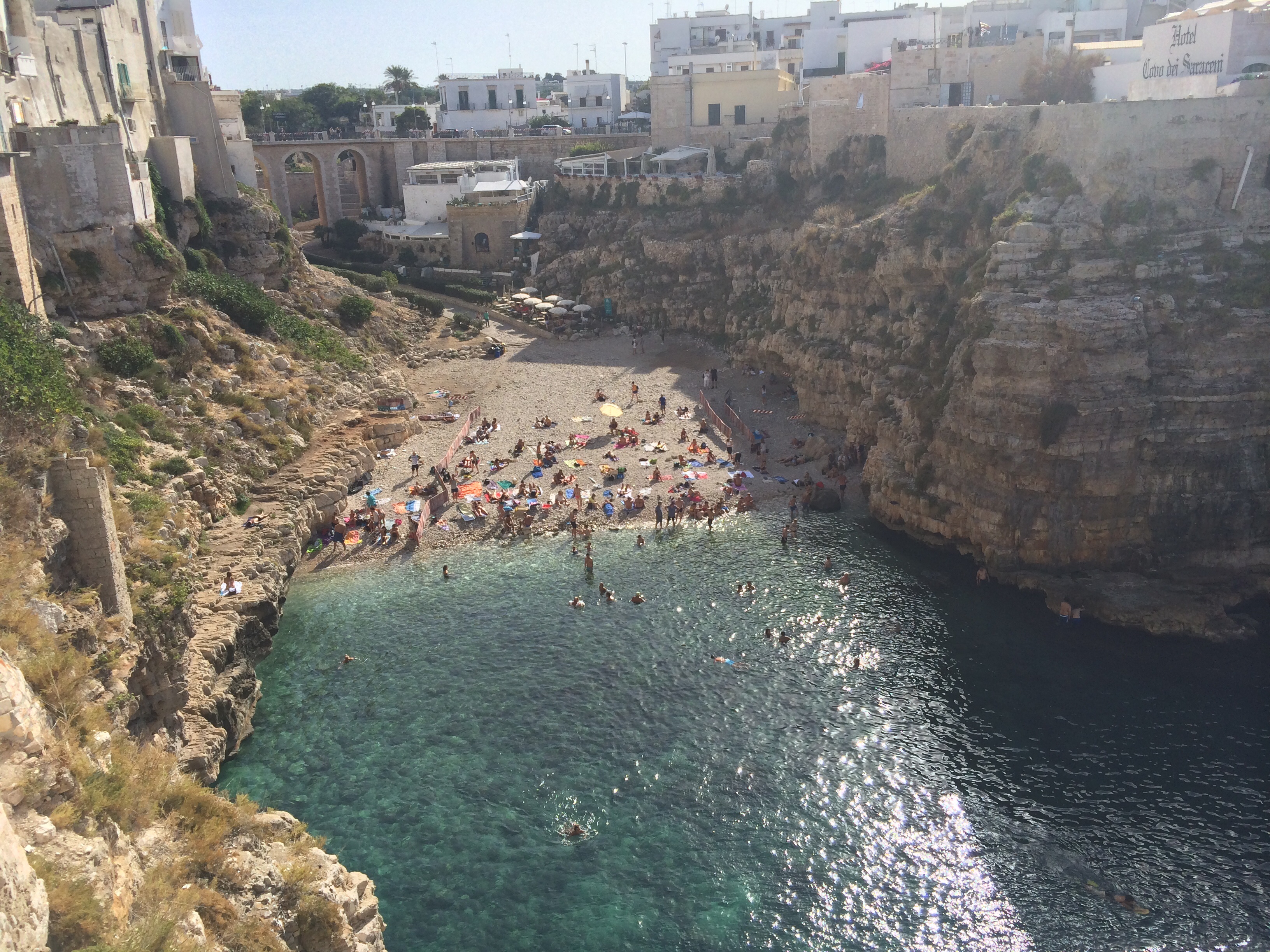 - Splash in the blue water and explore the caves under Polignano a Mare. This was quite an unexpected find. We were looking for a nice place to bathe and our masseria recommended this small city, perched on the Adriatic. There are several beaches that can be reached from the city center, including one that features a natural swimming pool, carved in the rock (photo below). There is no sand here so some water shoes will come in very handy to get in/out of the water easily. There is another beach that can be reached by taking a few winding steps down from in front the entrance to the old city of Polignano. The water was a bit clearer in the cove just outside the city but the city beach was also nice for a refreshing break after a day of sightseeing.