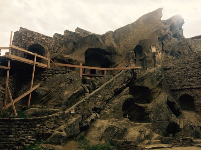 After visiting the complex, continue climbing for another 20 min, until you reach the top of the mountain and a smaller church. From there you can follow the metal railings on the other side of the mountain to visit the caves facing Azerbaijan. They have some beautifully preserved paintings and the vista over the rolling hills in Azerbaijan is the complete opposite for the desert like feel on the Georgian side. Be careful as there might be snakes in the area.