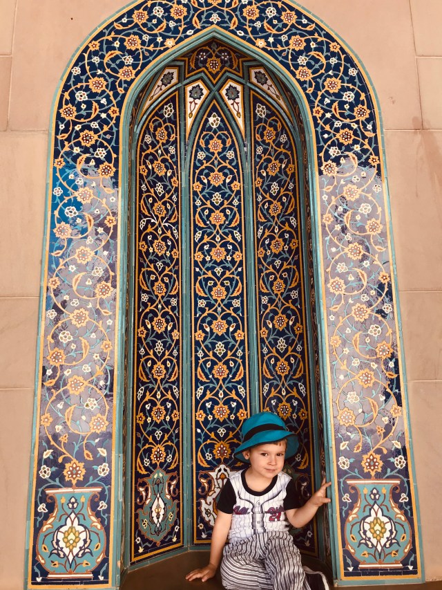 Start you sightseeing day at Sultan Qaboos Grand Mosque: the building has been inaugurated in 2001 to celebrate the 30th anniversary of Sultan Qaboos’ ascent to the throne; this mosque can accommodate over 20,000 worshipers and is a true masterpiece of modern architecture, harmoniously combining various artistic currents of the Islamic world from Maghreb to Central Asia. The mosque is only opened till lunchtime so it is best to make this the first stop. Women must be dressed with long skirts, sleeves and cover their head. There is only the main prayer hall that is not accessible to children below 10yo. We took turns to go inside while the other was taking Mr L to take beautiful photos of he gardens. The mosque complex is very big and you should allow 1h30 for the visit.