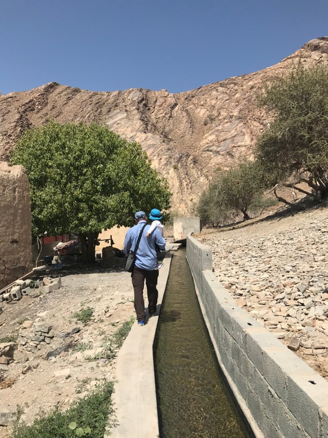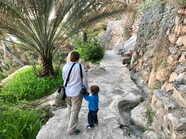 Perched on the steep mountain walls, here you can see old stone and the ancient system of cultivation on terraces. We took a lovely 1 h walk outside the village, following the yellow, red and white stripes signalling. It follows roughly the main irrigation channel and it takes you through cultivated terraces and and the rock. It is not a flat walk but still doable for the 3 year old even if the path would get narrow at times. After an hour of climbing the many steps in Misfah to discover the old city, it was a bit of a relief to have a more relaxed hike with such amazing views.