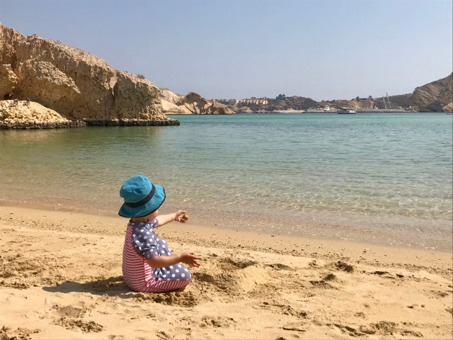 There are a few lovely resorts where you can enjoy the sea before getting back home. We chose Muscat Hills Resort, a former diving center now revamped into a series of beach huts. It is a small one compared to the Shangri-La, just accross the bay. We preffered it like this, as the atmosphere was more intimate and the hut was steps away from the beach. There were many families with young kids wrapping up their Oman or Muscat tours here even if there were no kids club or other kids dedicated activities except for enjoying the sandy beach.