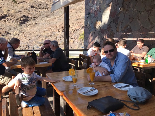 - Porto de las Nieves and one of the most scenic costal road rips. Starting in Maspalomas, this road rip takes on the whole Western side of the island. If you have enough time, a quick stop at Puerto de la Aldea is interesting. If not, head directly to Puerto de las Nieves as the trip will last about 2 h of scenic inland and coastal winding roads. We timed this with the kids mid- day naps to give us a bit of time for stops at viewpoints on the way and limited whining in the car. In Puerto de la Nieves there are several seafood restaurants lining the shore. For something a bit more modern, try Ragu. For a no frills affair, we quite enjoyed the fresh octopus at Cofradia de Pescadores. Ragu has a better view but both are lovely to see the sunset. We were there is early afternoon (5PM) and most restaurants were open and uncrowned. There is also pretty cool playground in the shape of a boat just behind the restaurants.